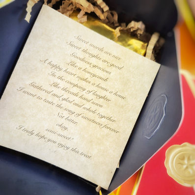 Special occasion cake w/ commissioned poetry art topped with 24k Gold, made with European ingredients, farm-fresh ingredients, & from-scratch butter. Cakes are steamed resulting in very moist crumb: